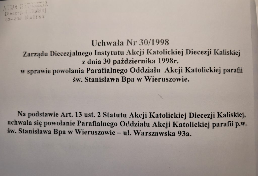 Pierwszym prezesem Akcji Katolickiej w naszej Parafii, mianowanym na to stanowisko przez Biskupa Kaliskiego Stanisława Napierałę w dniu 23 listopada 1997 roku, był pan Kazimierz Strzelecki, a parafialnym asystentem ks. prałat Henryk Orszulak.