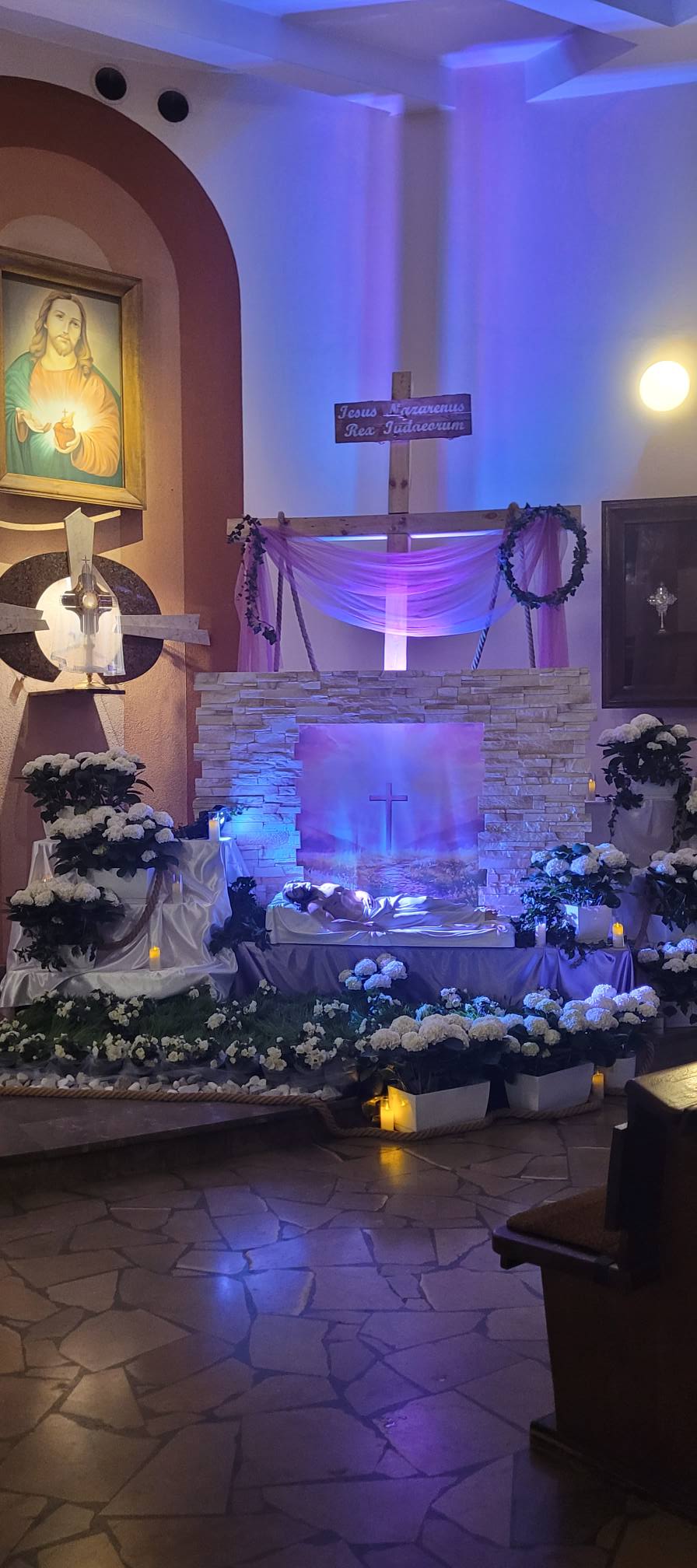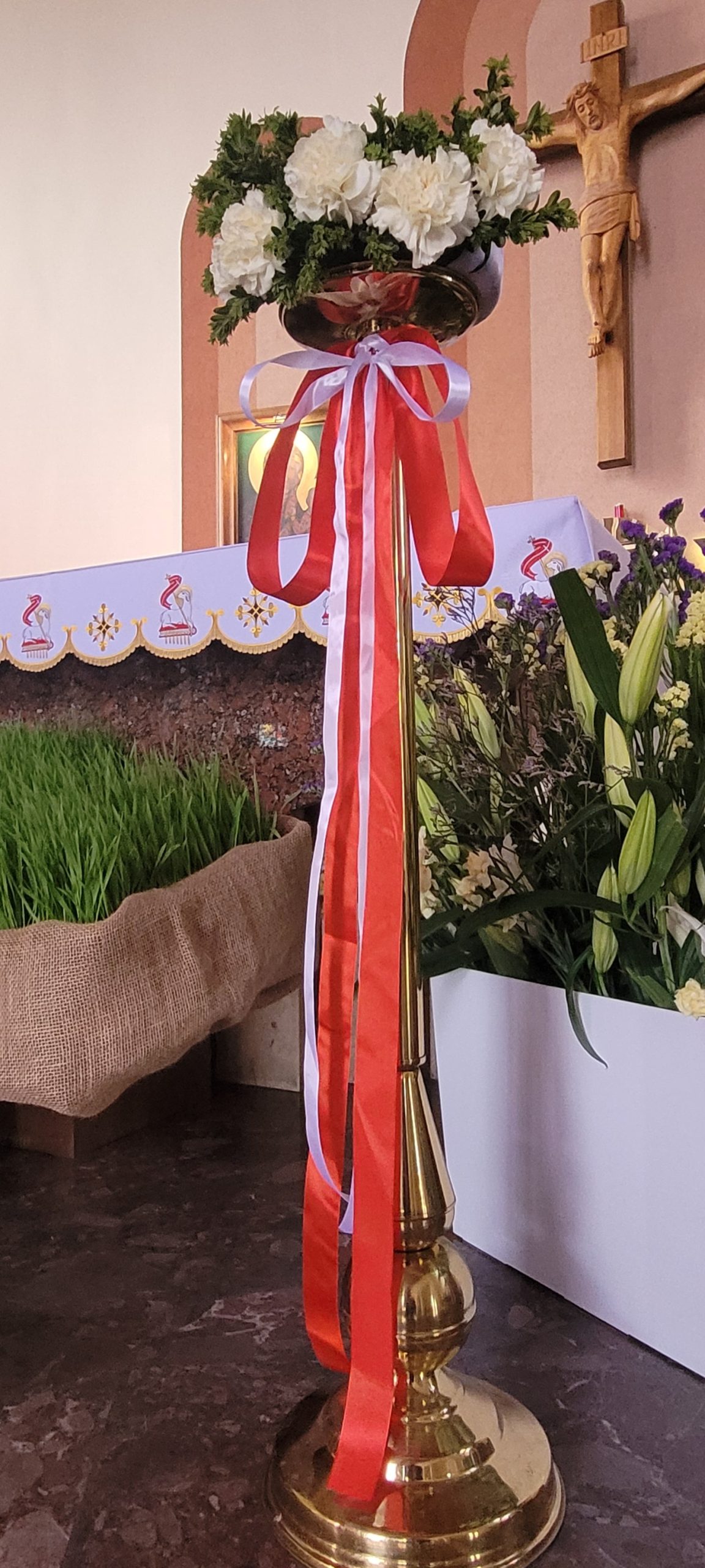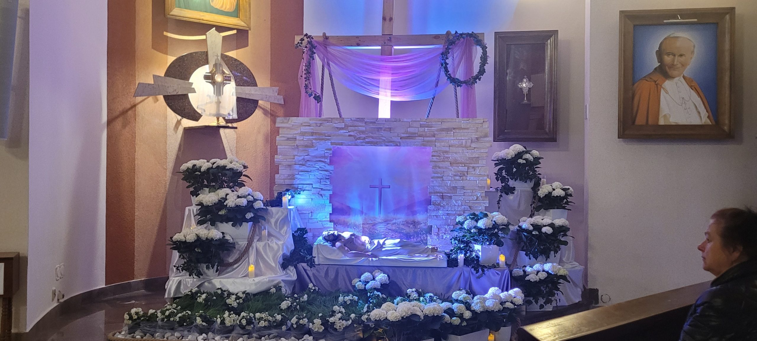 Trwa wielkosobotnia cisza i adoracja Jezusa w Grobie. Jesteśmy po poświęceniu pokarmów na jutrzejsze śniadanie wielkanocne. Ołtarz już też gotowy na dzisiejszą wieczorną Liturgię Wigilii Paschalnej. Wielkie ukłony dla Pań Justyny i Agnieszki oraz dla osób je wspomagających za piękny, świąteczny wystrój naszego kościoła.