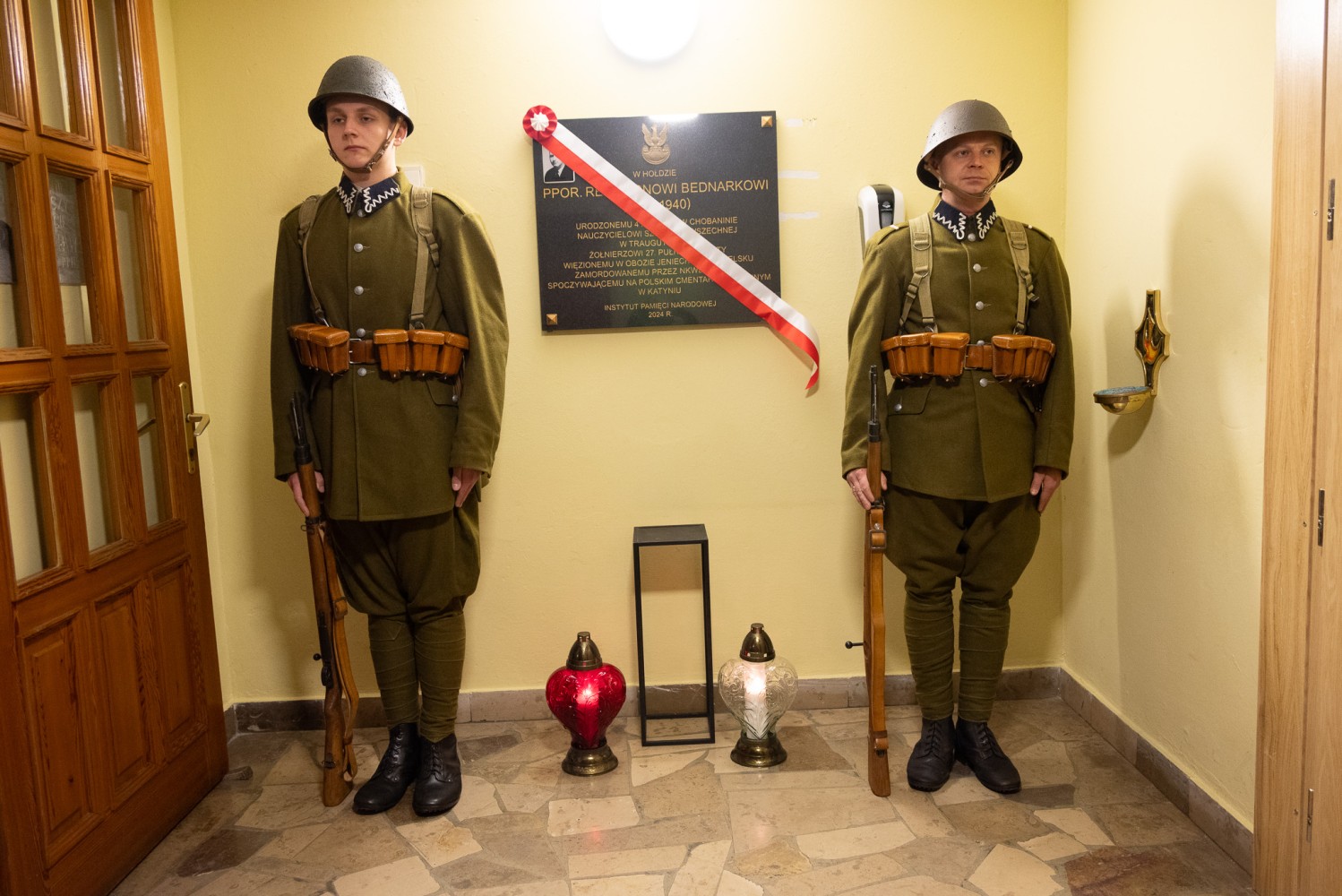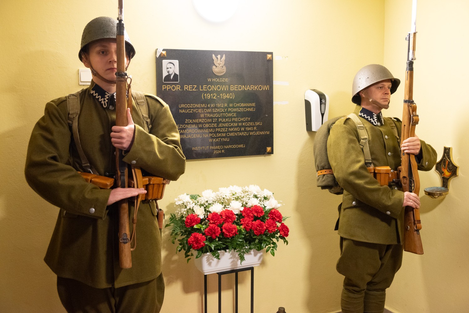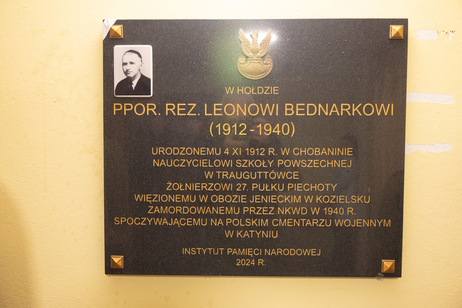 W niedzielny poranek (06.04) w Kaplicy p.w. Św. Urszuli Ledóchowskiej w Pieczyskach odbyła się msza połączona z uroczystością odsłonięcia i poświęcenia tablicy upamiętniającej urodzonego w Chobaninie i zamordowanego w Katyniu ppor. rez. Leona Bednarka. Na wydarzenie zaprosiła Parafia Św. Stanisława w Wieruszowie przy współpracy z Instytutem Pamięci Narodowej oraz inicjatorem upamiętnienia bohatera, sołtysem Dawidem Boryczko.  Mszy przewodniczył proboszcz ks. Łukasz Przybyła. W wydarzeniu wzięli udział członkowie rodziny bohatera, burmistrz Wieruszowa, przedstawiciele IPN, poczty sztandarowe. Wartę przy pamiątkowej tablicy pełnili rekonstruktorzy ze stowarzyszenia historycznego „Gloria Victis”. Leon Bednarek urodził się 4 listopada 1912 roku w Chobaninie, w rodzinie Józefa i Rozalii Bednarków. To właśnie tu kształtował się jego charakter w duchu wiary, tradycji i umiłowania polskiej ziemi. Swoją edukację rozpoczął w Pieczyskach i Wieruszowie, kontynuując ją w Państwowym Seminarium Nauczycielskim w Ostrzeszowie. W 1935 roku przeszedł szkolenie na III Dywizyjnym Kursie Podchorążych Rezerwy Piechoty. Podporucznik rezerwy piechoty mianowany ze starszeństwem 1. stycznia 1938 roku został przydzielony do 27. pułku piechoty. Został nauczycielem, bo wierzył, że naród buduje się w szkole. Wybrał drogę nauczyciela, niosąc w dalekiej Trauguttówce na Wołyniu wartości wiedzy, patriotyzmu i miłości do Ojczyzny. Jednak przyszły czasy, w których wiedza nie wystarczała. Przyszły czasy, w których Ojczyznę trzeba było bronić nie słowem, lecz bronią. We wrześniu 1939 roku, jako podporucznik rezerwy 27 pułku piechoty z Częstochowy, mężnie stanął do walki z niemieckim agresorem. Wkrótce potem został schwytany przez wojska sowieckie i osadzony w obozie w Kozielsku – miejscu cierpienia i śmierci polskiej elity, której jedyną „winą” była miłość do Ojczyzny i przywiązanie do wolności. Wiosną 1940 roku Leon Bednarek został brutalnie zamordowany przez NKWD. Jednym strzałem w tył głowy – odebrano mu życie, a rodzinie – możliwość pożegnania. Jego ciało, jak i tysiące innych, wrzucono do zbiorowej mogiły. Był to haniebny mord dokonany na najlepszych synach Polski – oficerach, intelektualistach, nauczycielach, lekarzach, duchownych – na tych, którzy byli sercem i nadzieją narodu. Była to świadoma próba unicestwienia elit narodowych, by nigdy nie odzyskano dawnej siły i wielkości. Rodzice Leona – Józef i Rozalia – nigdy nie poznali bolesnej prawdy o śmierci swojego syna, podobnie jak jego rodzeństwo: Antoni, Czesław, Maria i Stefan. Nie wiedzieli, co się z nim stało. Czekali. Wypatrywali. Modlili się o cud, którego nie było. Pewnego dnia, wciąż w czasie wojny, ktoś zapukał do drzwi domu Bednarków. Nie powiedział nic. I nie trzeba było. Przyniósł zakrwawiony wojskowy płaszcz. Płaszcz Leona. To była jedyna rzecz, która z niego wróciła. Jedyny dowód, że istniał. Że walczył. Że zginął. – Nie było aktu zgonu. Nie było grobu. Nie było słów, które mogłyby ukoić ból. Przez całe życie jego rodzice i rodzeństwo trwali między nadzieją a rozpaczą – niepewni, ale przeczuwający najgorsze. Nie mogli zapalić świecy nad jego grobem, nie mogli wypowiedzieć ostatniego „żegnaj”. Zostali z ciszą. Zostali z krwią zaschniętą na mundurze, która przez dziesiątki lat krzyczała za nich – że prawda została zakopana razem z ciałem – mówiła Marta Kowalińska z rodziny zamordowanego. – Teraz, kiedy wszyscy z nich są już po drugiej stronie życia, pamięć o nim pielęgnują kolejne pokolenia rodziny, niosąc w sercach dumę i nieustający szacunek do jego osoby. W 2007 roku Leon Bednarek został pośmiertnie awansowany na stopień porucznika. „Ojczyzna to wielki zbiorowy obowiązek” – mówił Cyprian Kamil Norwid. „Naród, który nie zna swojej przeszłości, umiera i nie buduje przyszłości” – przypominał święty Jan Paweł II. Leon Bednarek, spełniając swój obowiązek wobec Ojczyzny, oddał najwyższą ofiarę – swoje życie – kontynuowała Marta Kowalińska. – Dziś składamy hołd wszystkim ofiarom Katynia, których milczące bohaterstwo pozostaje nieśmiertelną lekcją patriotyzmu dla kolejnych pokoleń Polaków. Pamiętajmy również o latach spędzonych przez Leona w Chobaninie – miejscu, które na zawsze pozostało w jego sercu symbolem domu, rodziny i polskości. Leon Bednarek żył krótko, ale dzięki heroicznej postawie stał się na zawsze przykładem męstwa, patriotyzmu i niezachwianej wiary. Niech odpoczywa w pokoju. Niech jego pamięć trwa na wieki. Cześć Jego pamięci! ŻRÓDŁO: tugazeta.pl
